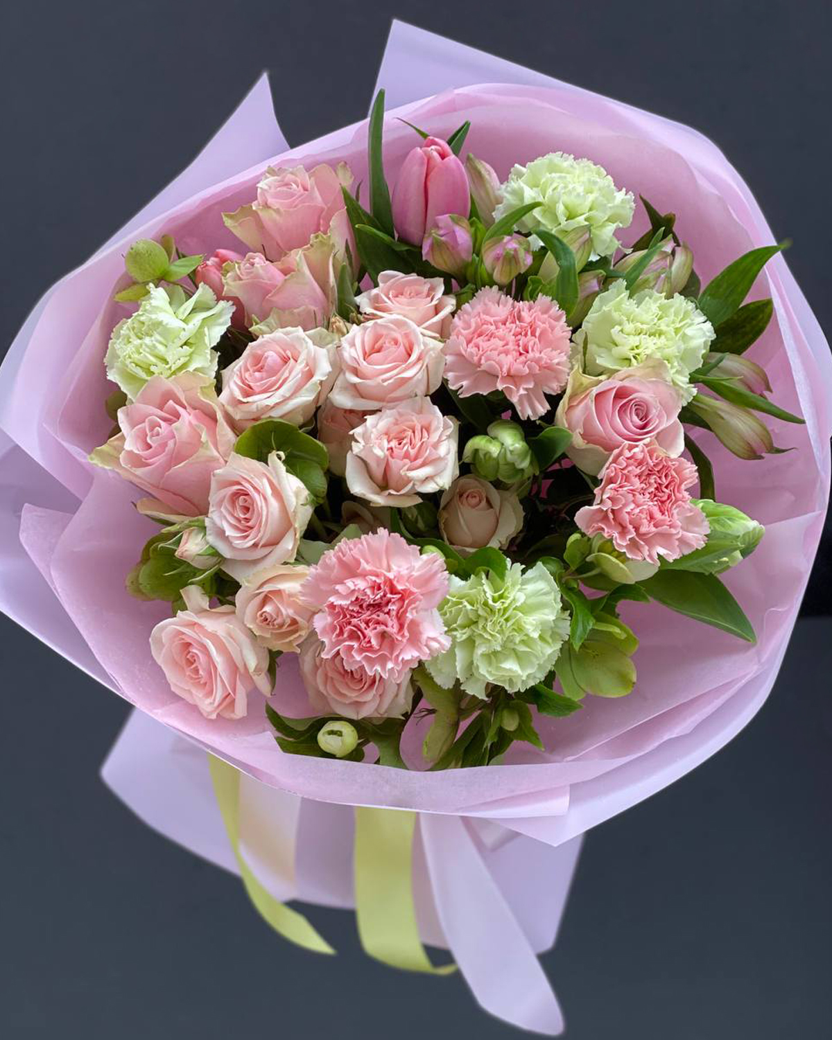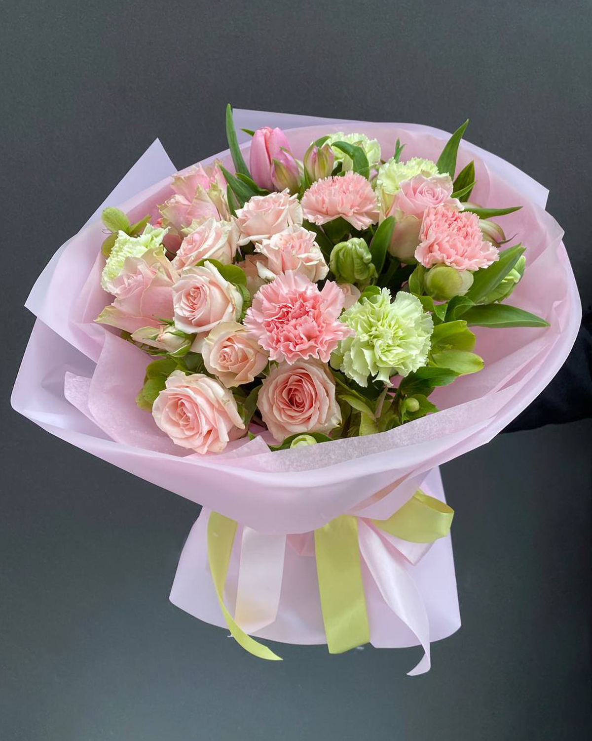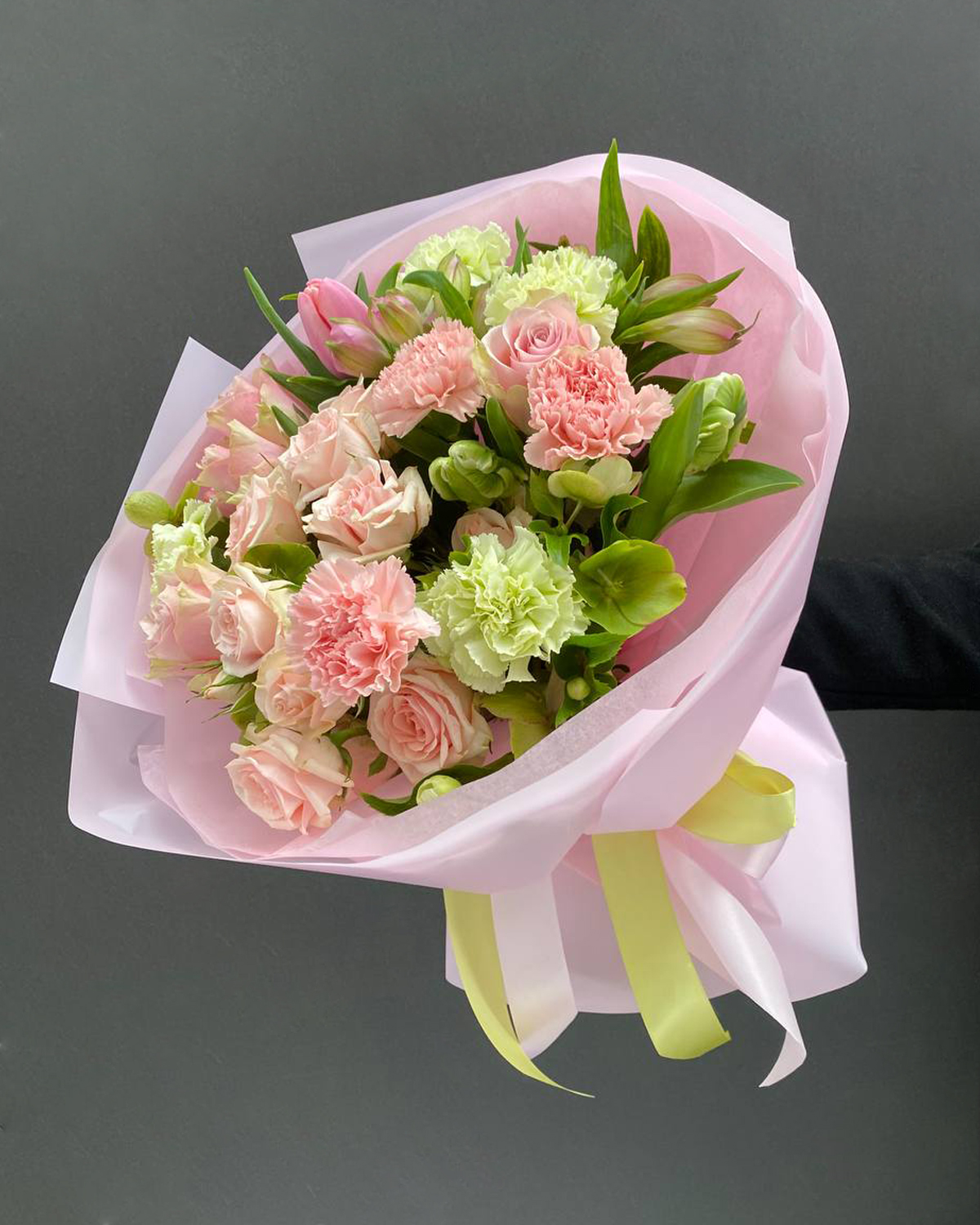 Bukiet łączy różnorodne kwiaty: 2 tulipany różowe, 4 różowe róże, 7 goździków, 2 helleborusy, 2 klasyczne tulipany, 2 duże róże gałązkowe oraz 2 duże alstromerie. Ta harmonijna kompozycja tworzy kobiecą i elegancką całość, która wywoła uśmiech na twarzy każdej obdarowanej osoby.