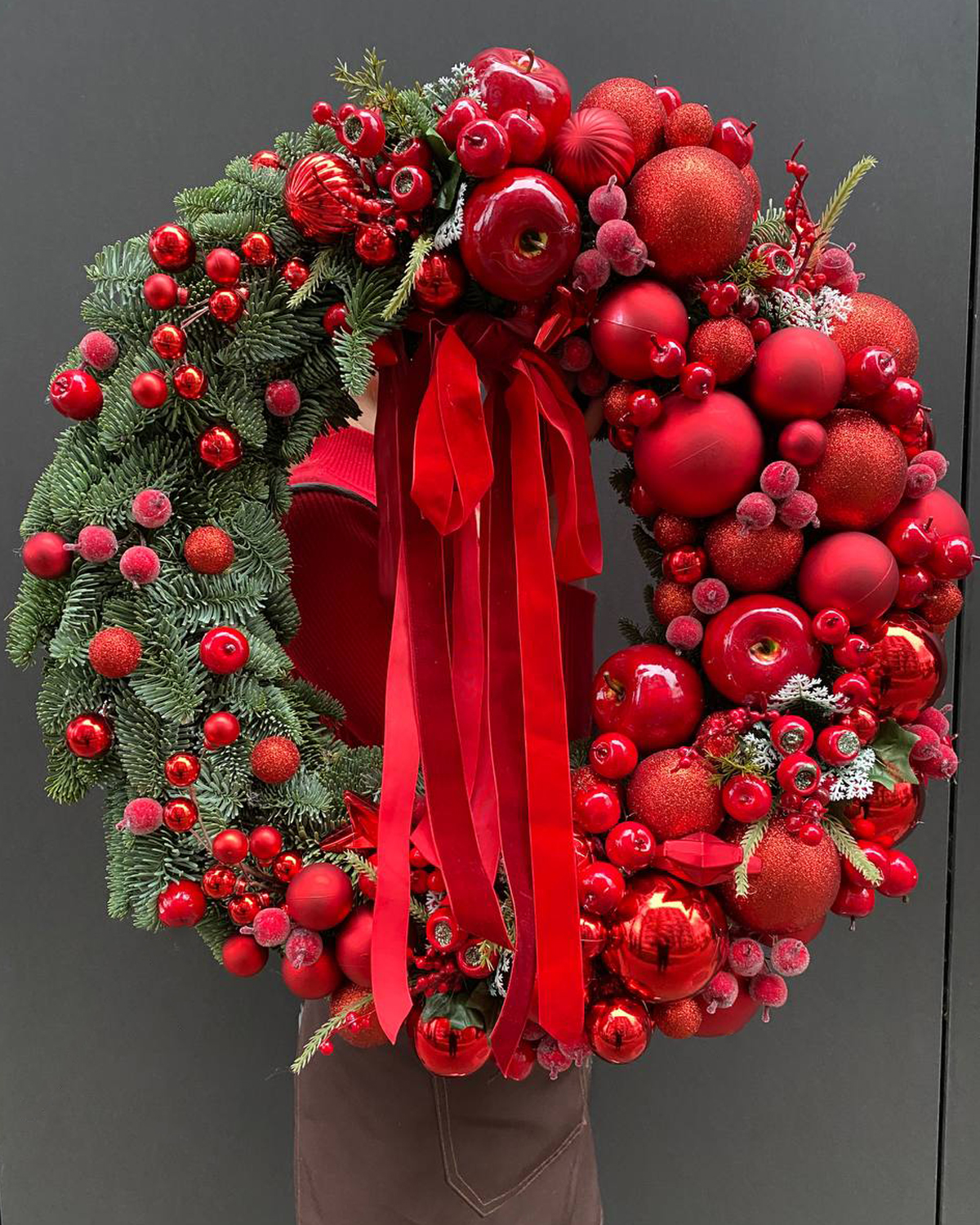 Drugą połowę dekoracji stanowią gęste, ręcznie układane gałązki świeżej jodły, nadające całości naturalną strukturę, wyjątkowy aromat i harmonijny kontrast wobec intensywnej czerwieni bombek. Zestawienie tych dwóch materiałów sprawia, że wianek prezentuje się nowocześnie, stylowo i idealnie wpisuje się w świąteczne trendy.
