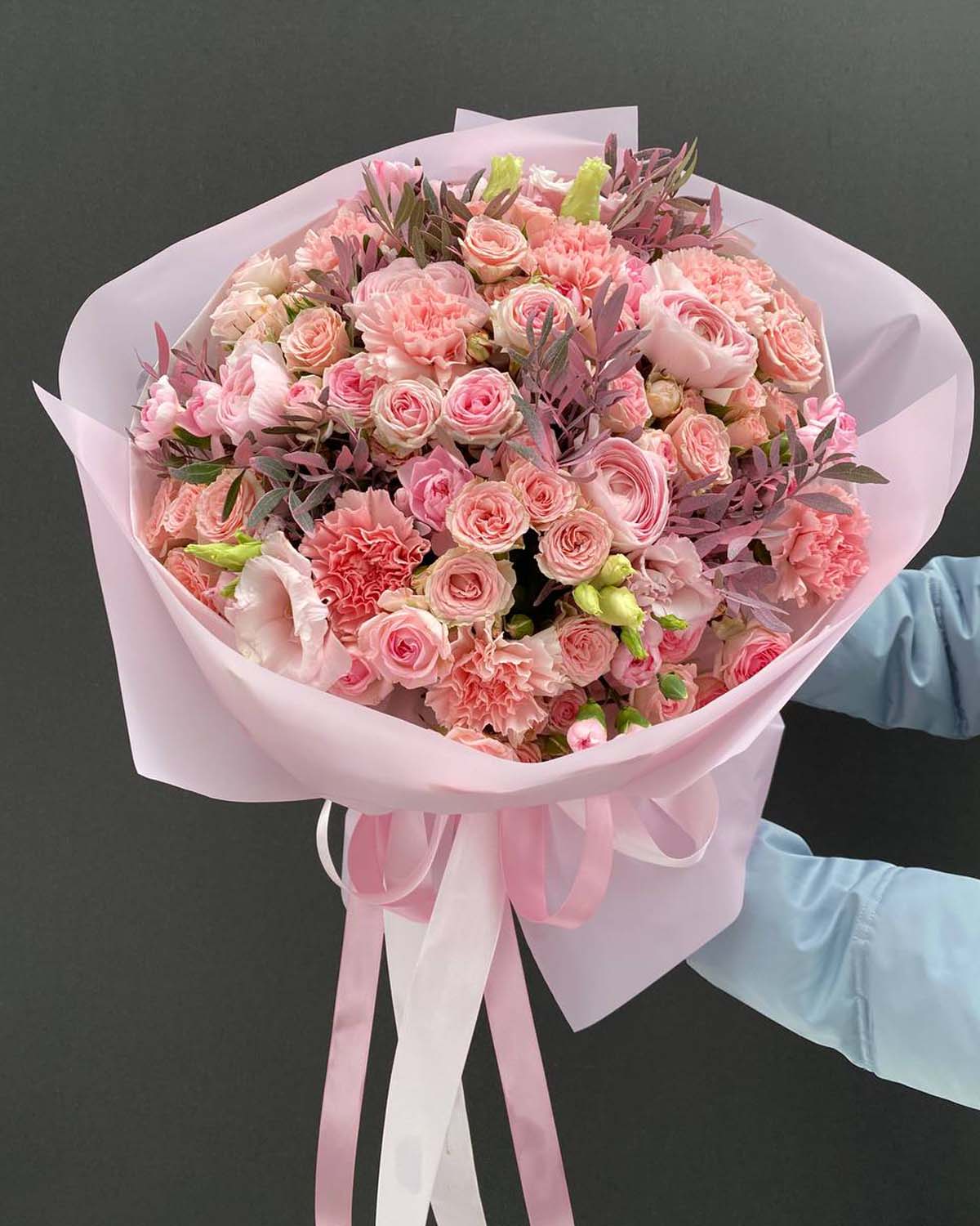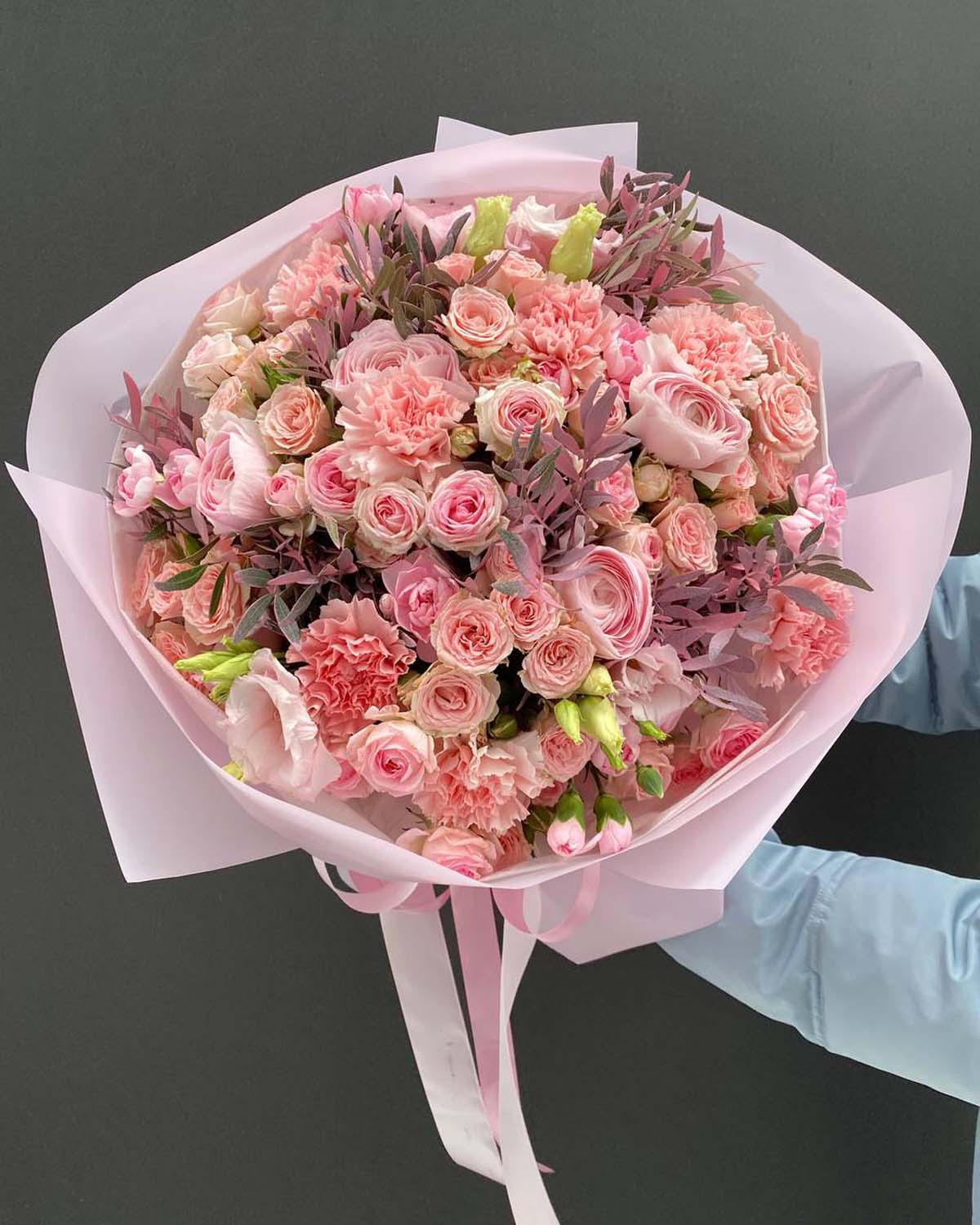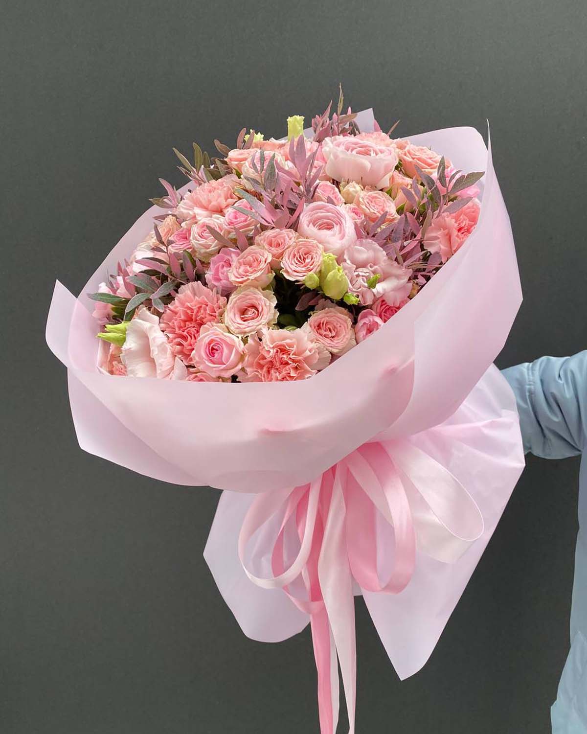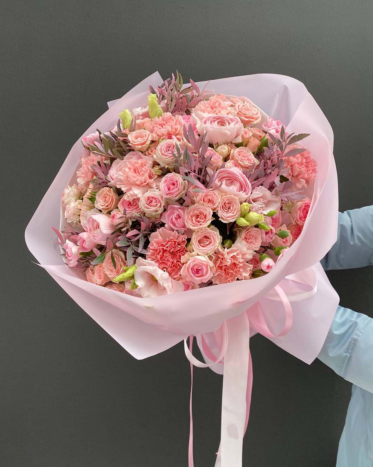 Rożowa harmonia – elegancki i romantyczny bukiet w delikatnych odcieniach różu. Połączenie ranunkulusów, róż gałązkowych, goździków i eustomy tworzy bogatą, a jednocześnie subtelną kompozycję. Pistacja dodaje świeżości i naturalnej lekkości. Idealny wybór na wyjątkowe okazje, takie jak urodziny, rocznica czy prezent pełen czułości. Na zdjęciu prezentowany jest rozmiar L – szerokość 65 cm, wysokość 65 cm.