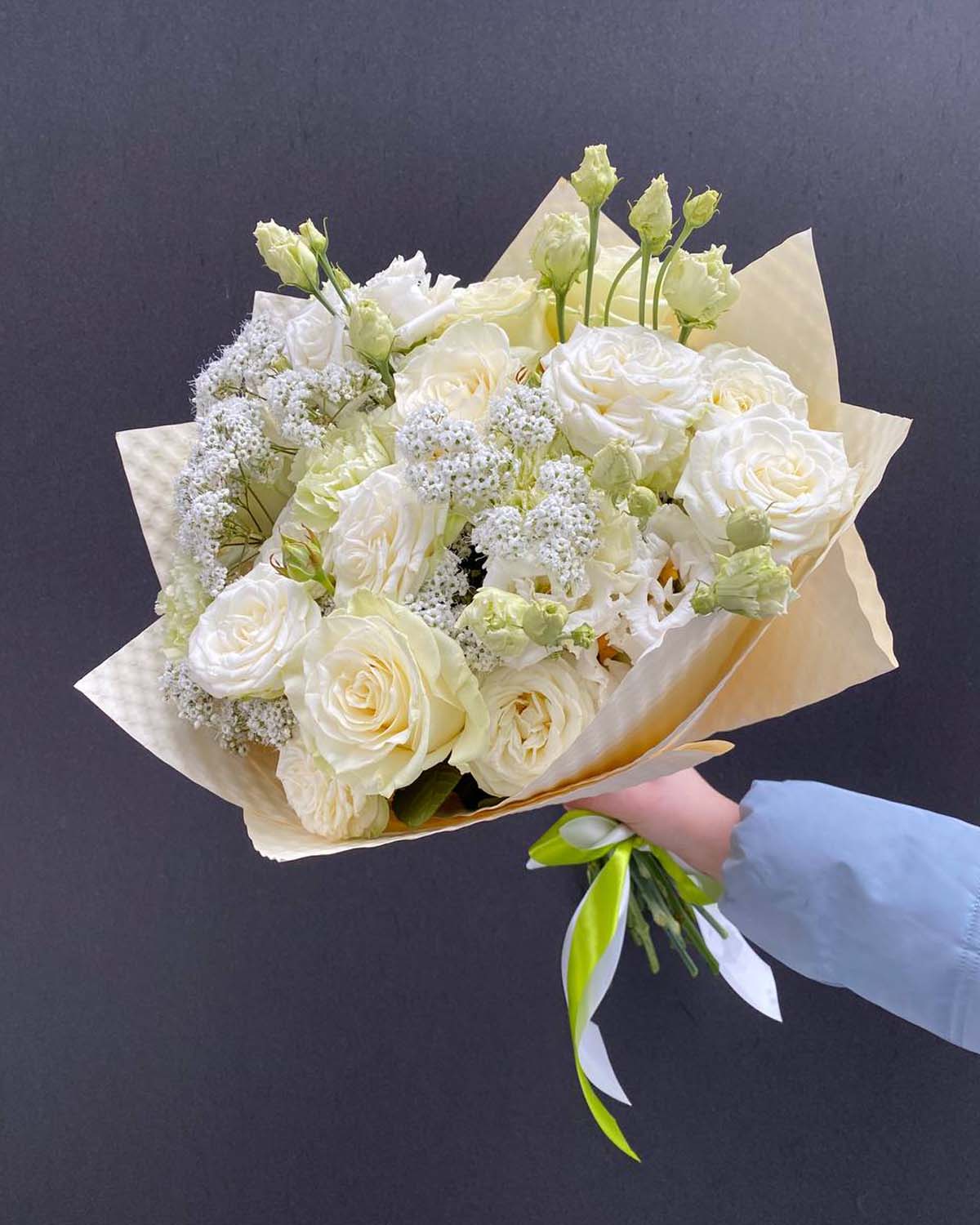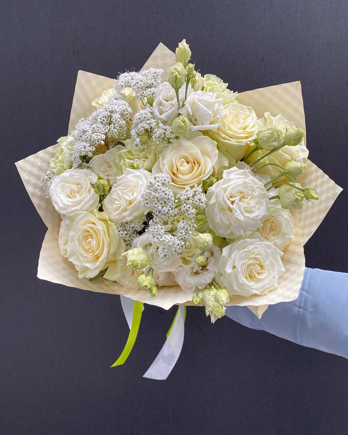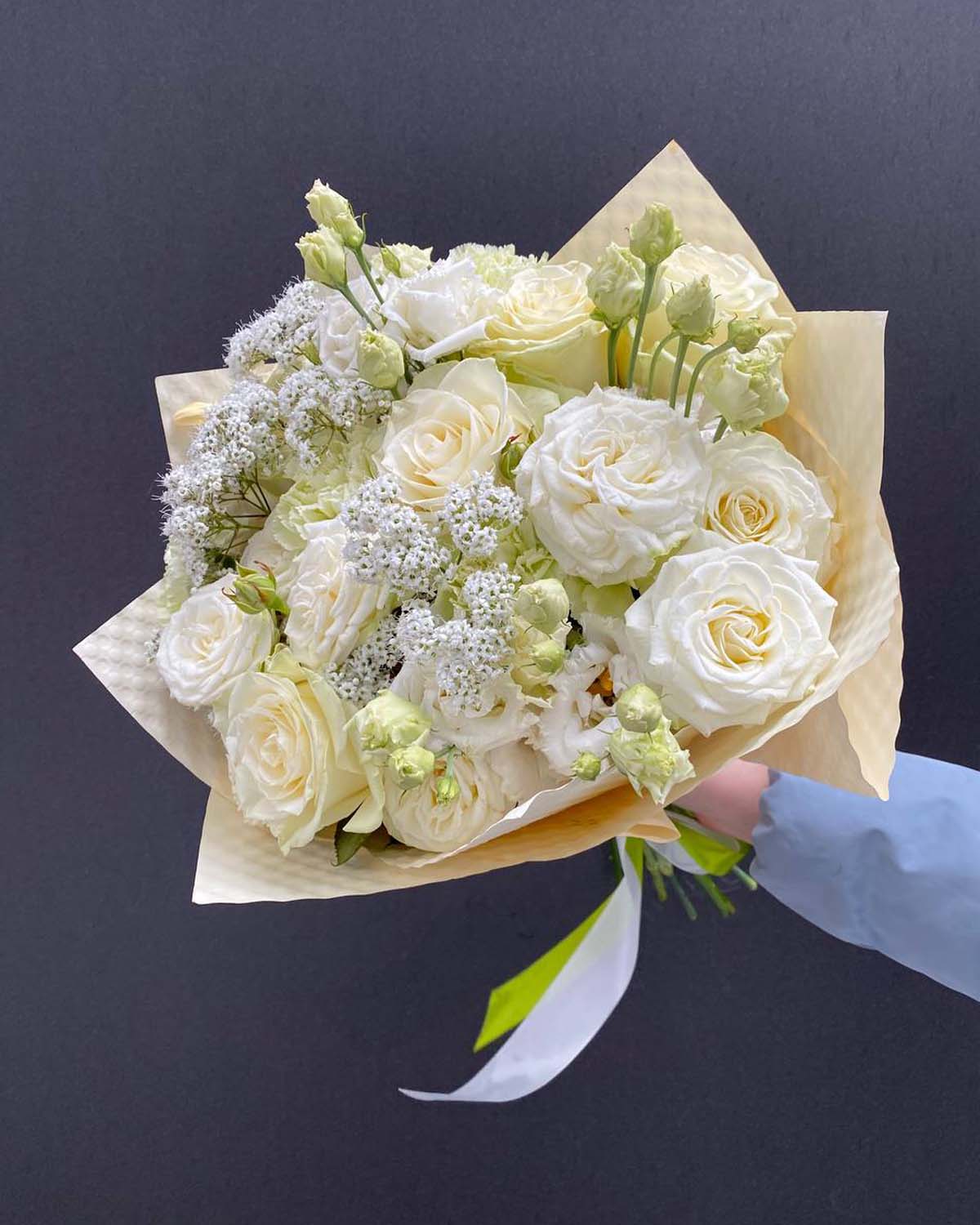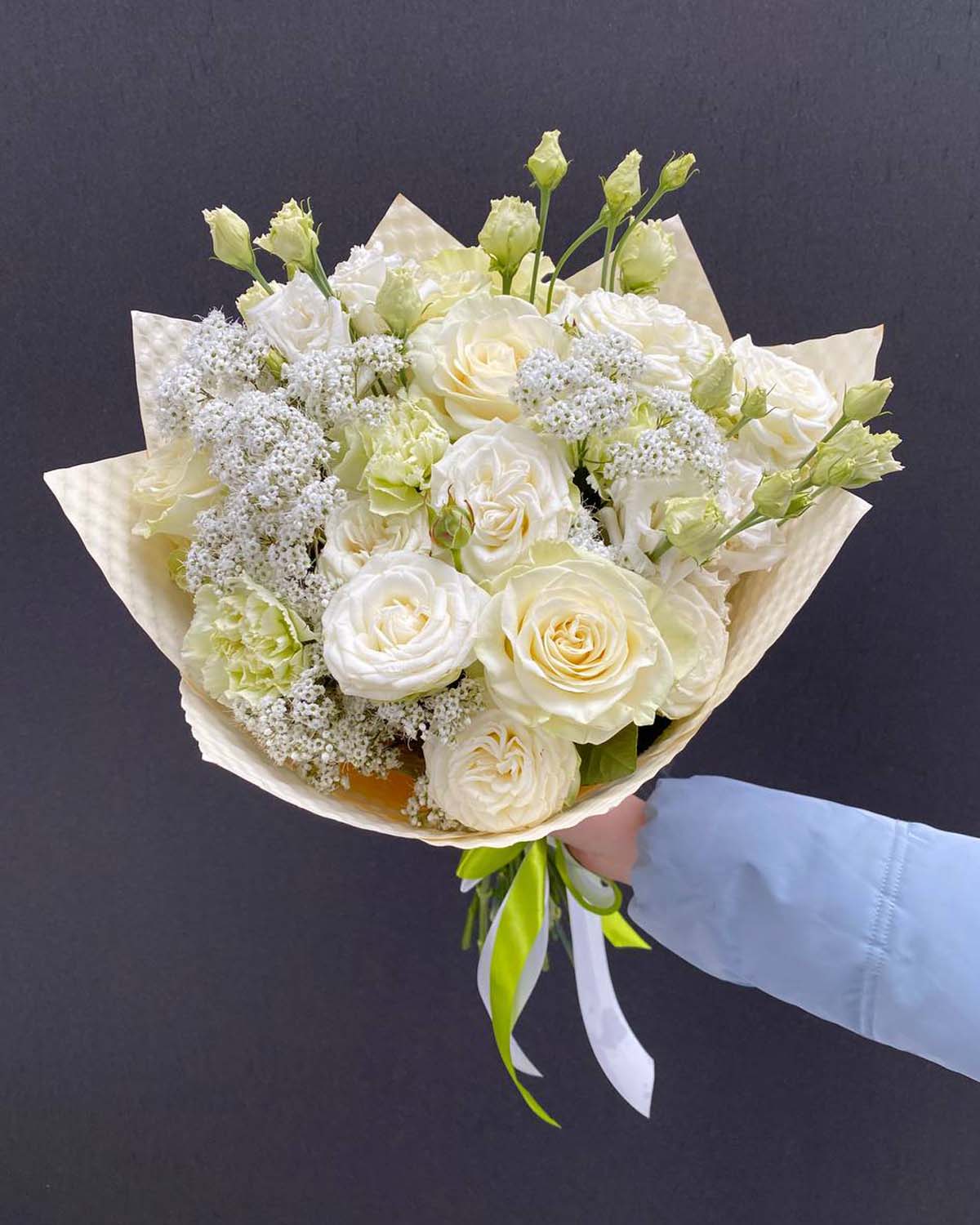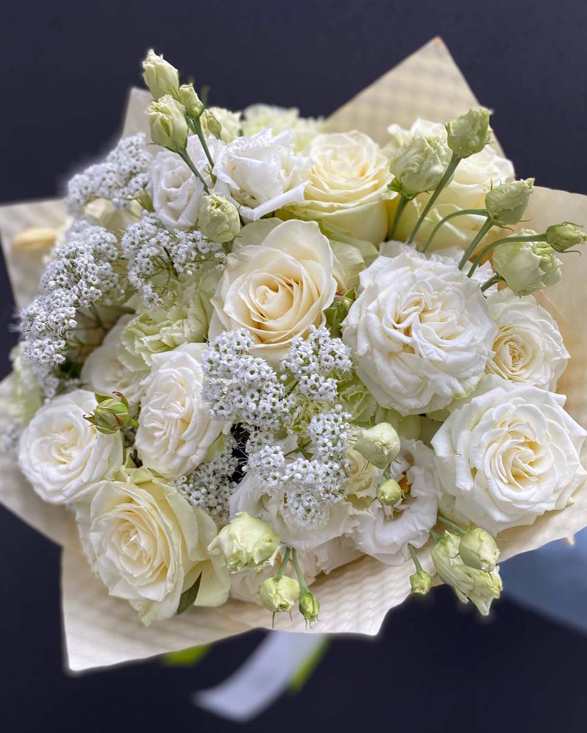 Klasyczne białe róże nadają bukietowi elegancji, efektowne róże Bombastic wprowadzają objętość i luksusowy charakter, a delikatna eustoma i subtelna gipsówka dodają lekkości i romantycznego wyrazu. Całość dopełniają goździki, podkreślające trwałość i estetykę kompozycji.