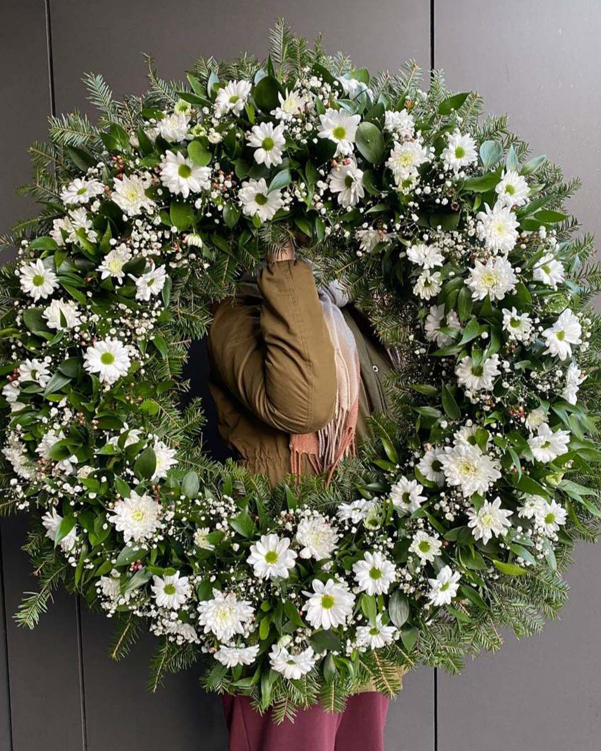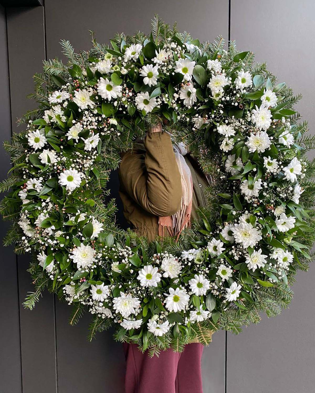 Elegancki wieniec pogrzebowy o średnicy 1 metra, wykonany w stonowanej, klasycznej stylistyce, przeznaczony do godnego pożegnania oraz wyrażenia szacunku i pamięci. Podstawę kompozycji stanowi naturalna zieleń w postaci gałęzi świerkowych oraz ruskusu, symbolizujących wieczność i spokój. Kompozycja kwiatowa składa się z delikatnych margerytek, puszystych chryzantem oraz gipsówki, które nadają całości lekkości i harmonii. Biel i zieleń podkreślają szczerość uczuć oraz głębię kondolencji. Wieniec doskonale sprawdzi się podczas ceremonii pogrzebowych, uroczystości pożegnalnych oraz jako forma upamiętnienia na cmentarzu. W zestawie znajduje się stabilna drewniana podstawka oraz wstęga pogrzebowa z możliwością dodania indywidualnego napisu.